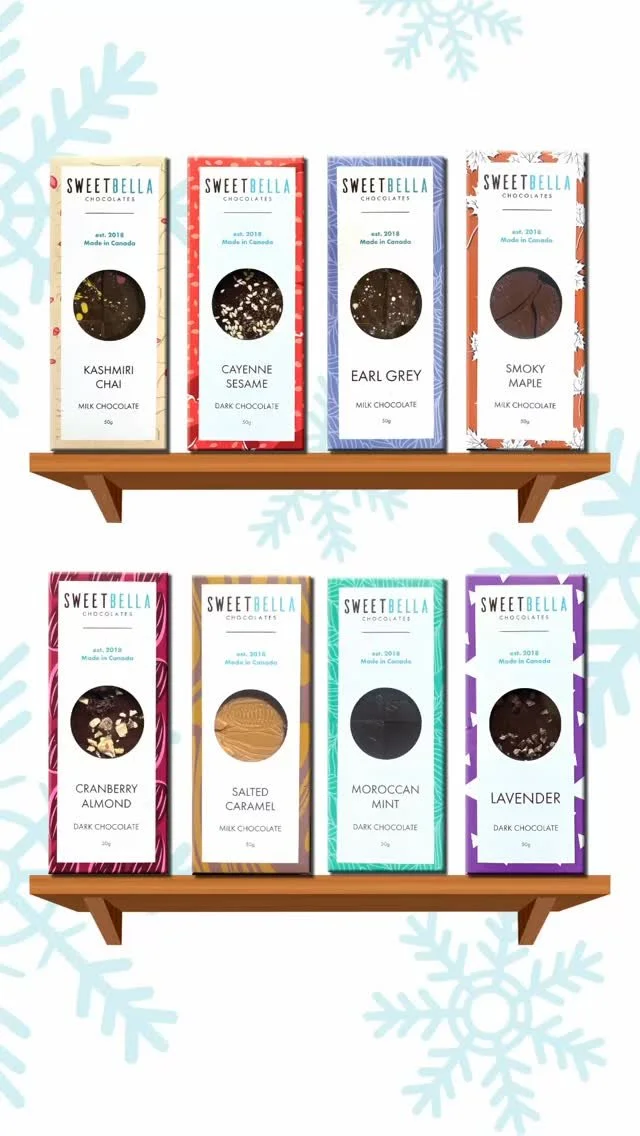 Sweet Bella is a proudly Canadian chocolate company based in Calgary, Alberta. What started as a passion project has grown into a beloved local brand, with every bar handcrafted using premium ingredients and a whole lot of heart. We partner with local distributors and independent retailers to bring our bold, artistic chocolate to markets across Western Canada and beyond.
